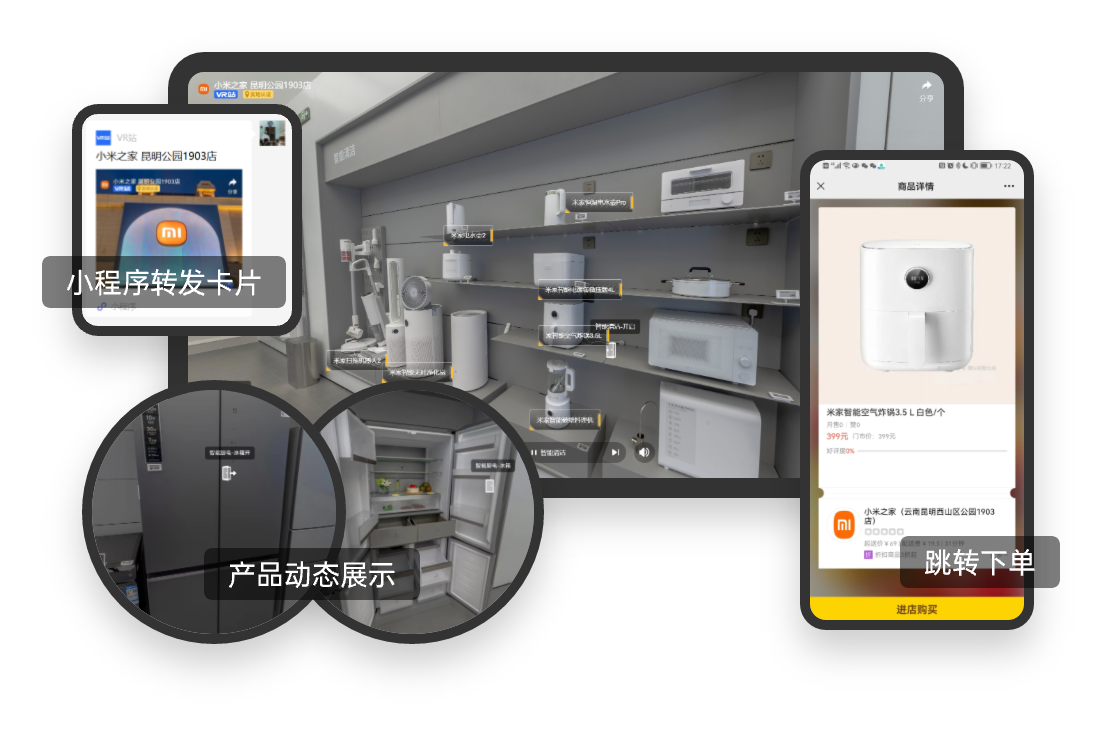 靈活配置商品互動(dòng)熱點(diǎn)/廣告位/活動(dòng)鏈接等,不僅提升場(chǎng)景營(yíng)銷(xiāo)氛圍,更能實(shí)現(xiàn)下單交易。支持投放各大流量平臺(tái),接入小程序/公眾號(hào)等流量渠道,助力商家打造元宇宙營(yíng)銷(xiāo)活動(dòng)。