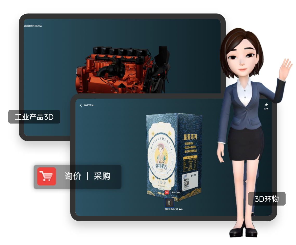 全方位全場景展示實力借助VR/3D技術(shù)把企業(yè)公司搬到云端,透明化展示公司產(chǎn)品、企業(yè)內(nèi)部的環(huán)境/設(shè)備/研發(fā)等;更有AI虛擬人接待,帶客戶身臨其境的深度體驗公司實力。