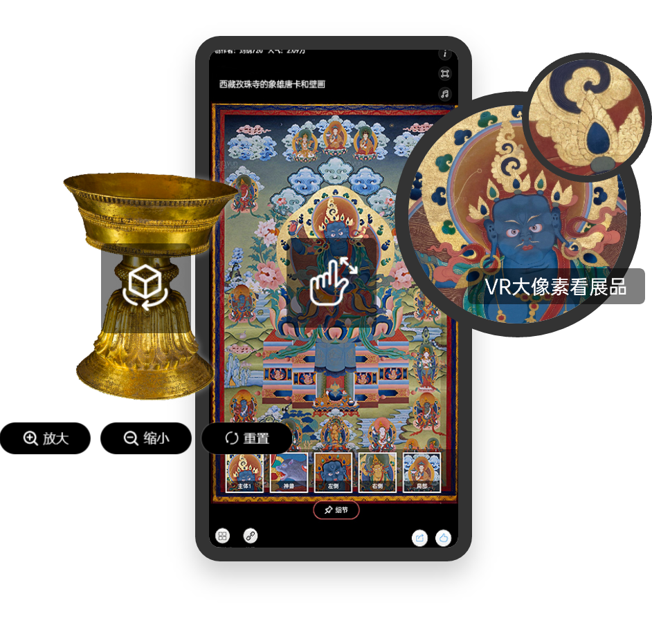 多維度增強(qiáng)互動體驗(yàn)感3D環(huán)物+VR大像素看展品+AR互動,實(shí)現(xiàn)展品/文物藏品超高清、數(shù)字化展示呈現(xiàn);方便觀眾360°放大觀看細(xì)節(jié),還能復(fù)用于NFT數(shù)字藏品發(fā)行。